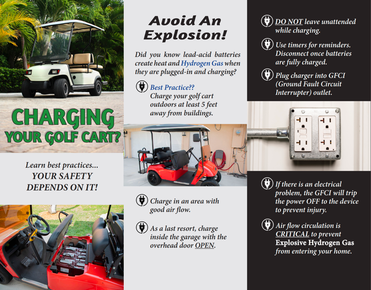 The hydrogen gas produced from improperly, or over-charging a golf cart, can unknowingly spread into your home causing a life-threatening situation. Fortunately, these dangers are preventable! Be safe, follow the guidelines below.