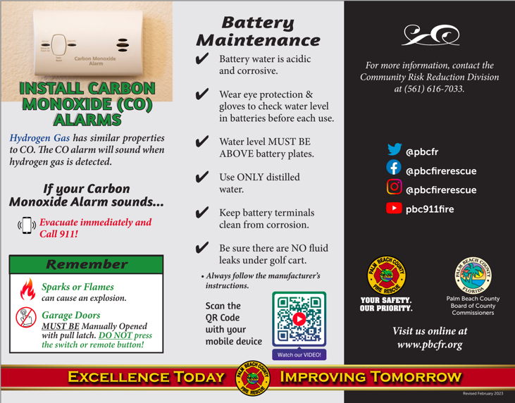 Palm Beach County Fire Rescue responds to countless Carbon Monoxide (CO) alarm activations. However, many of these activations are caused by HYDROGEN GAS that results from improperly charging of golf carts – NOT by carbon monoxide. Both of these gases are odorless and colorless and are silent killers. Think of a Carbon Monoxide alarm as an oxygen displacement alarm. As the amount of oxygen in a room decreases and the level of carbon monoxide (or hydrogen) increases, the CO alarm will sound these two gases (CO and Hydrogen) have similar properties.